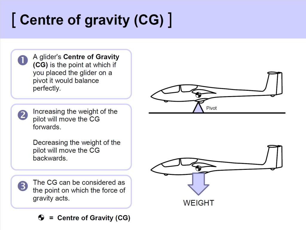 - The Centre of Gravity is the point on which the glider would balance (fore and aft)