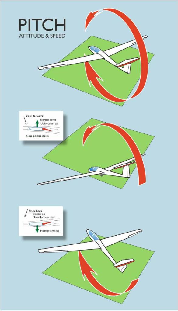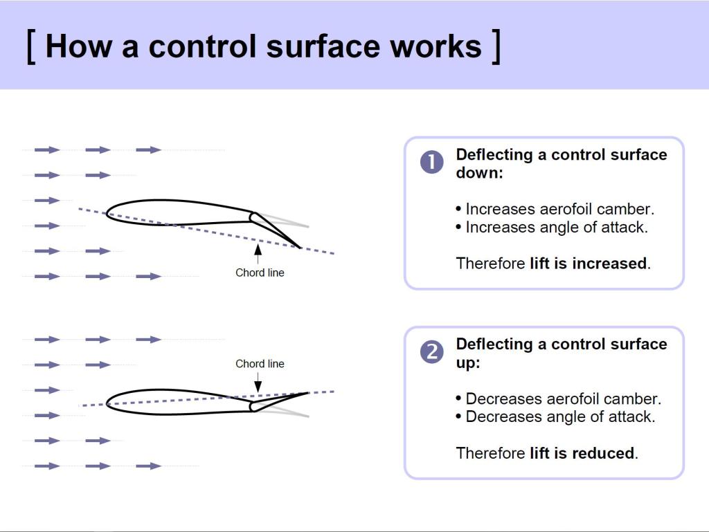 - The Control Surfaces are moved by the stick and rudder pedals to change these aerofoils, creating: