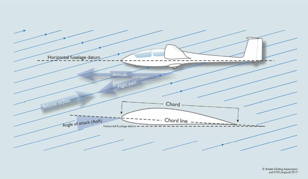 - Angle of Attack (AoA): angle between the relative airflow and the chord line.